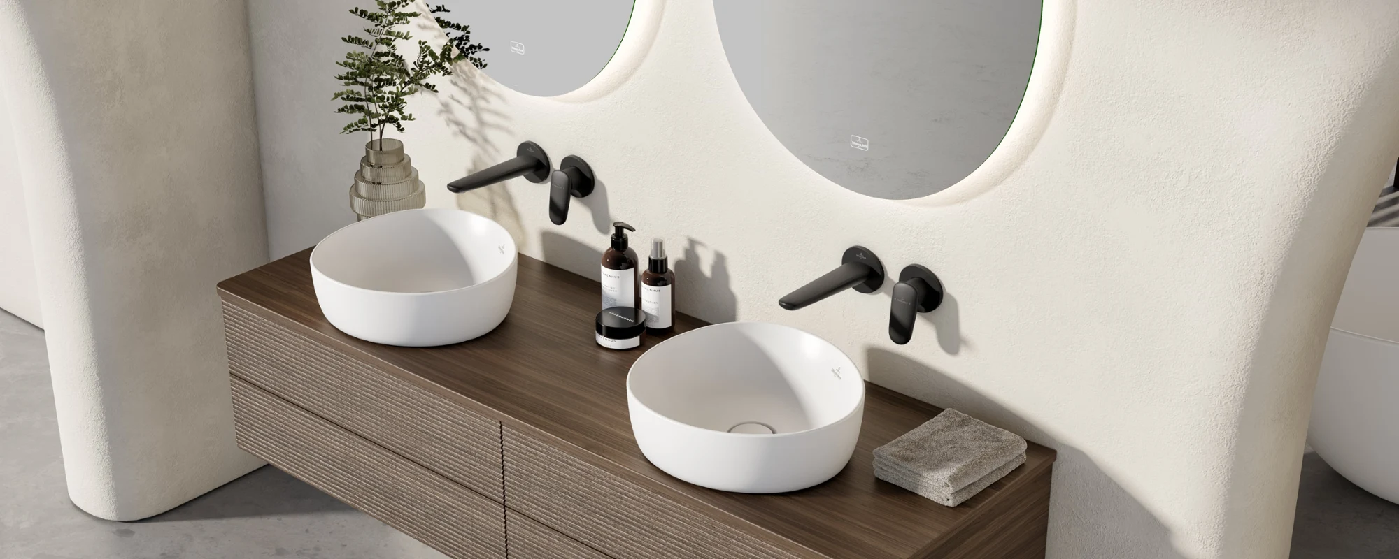 Different designs for different interior styles: choose from a wide selection of coordinating washbasin taps from Villeroy & Boch and create your very own dream bathroom. Whether on the wall or on a raised base – find the perfect taps to coordinate with your Antao washbasin.