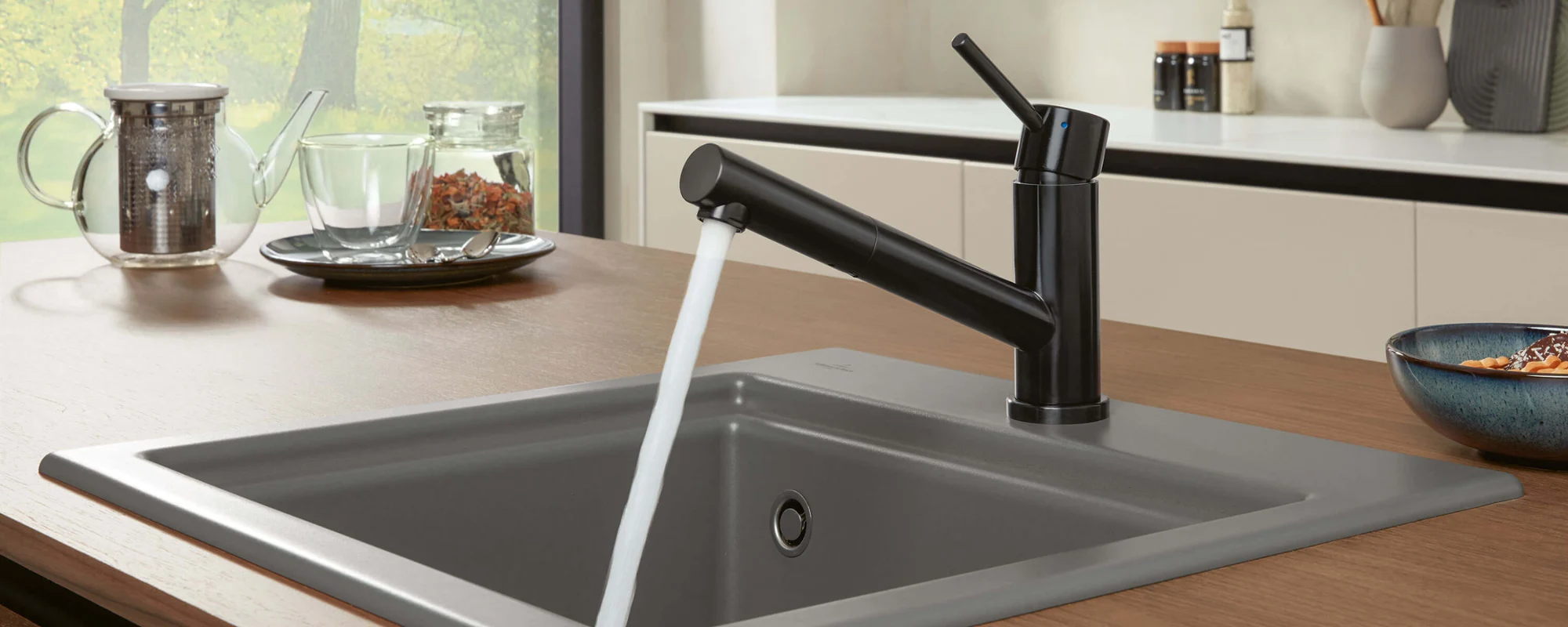 The delicate lever makes it easy to operate Como with one hand. Thanks to their high spout, the new Como Sky and Como Sky Shower models offer a high level of comfort when washing up, boosted by the large swivel range of the spout. Como Sky Shower provides maximum manoeuvrability with its long, integrated hand spray. And Como Window is the uniquely flexible solution for a washing-up area in front of the window.