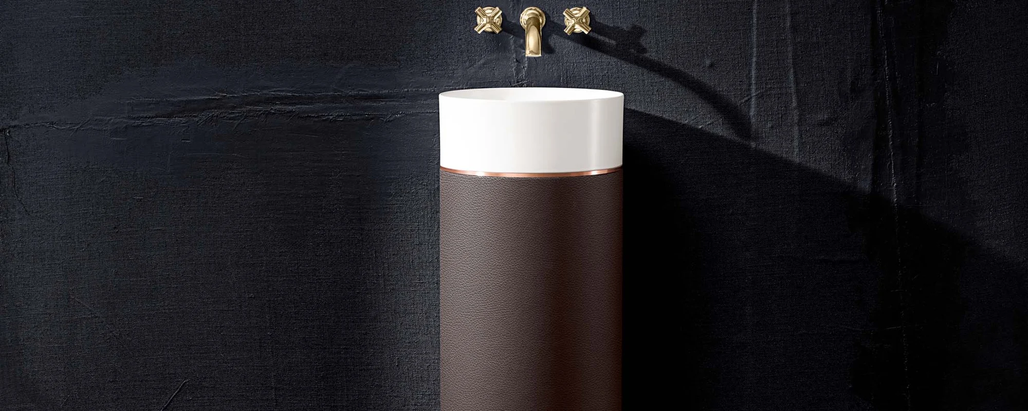 The elegant decorative copper band creates a shiny transition with the manually applied surfaces of the pedestal. Choose your favourite finish from the four stylish options of real wood veneer, slate, leather and leather look.