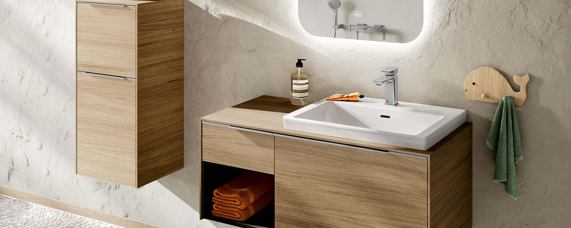 A vanity washbasin combines aesthetics and functionality: the single unit consisting of washbasin and cabinet provides stylish storage space for your bathroom utensils.