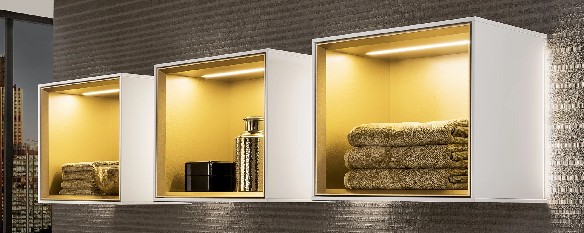 Open bathroom shelves offer flexible storage space, create decorative accents and are easy to retrofit. Interior lighting emphasises details and individually selectable colours fit perfectly into the bathroom design.